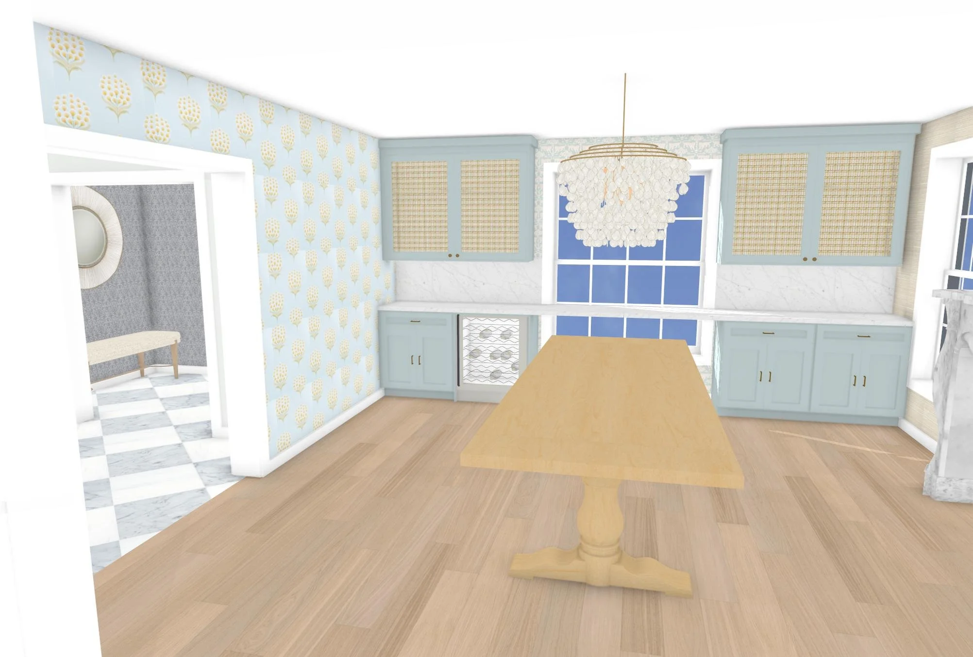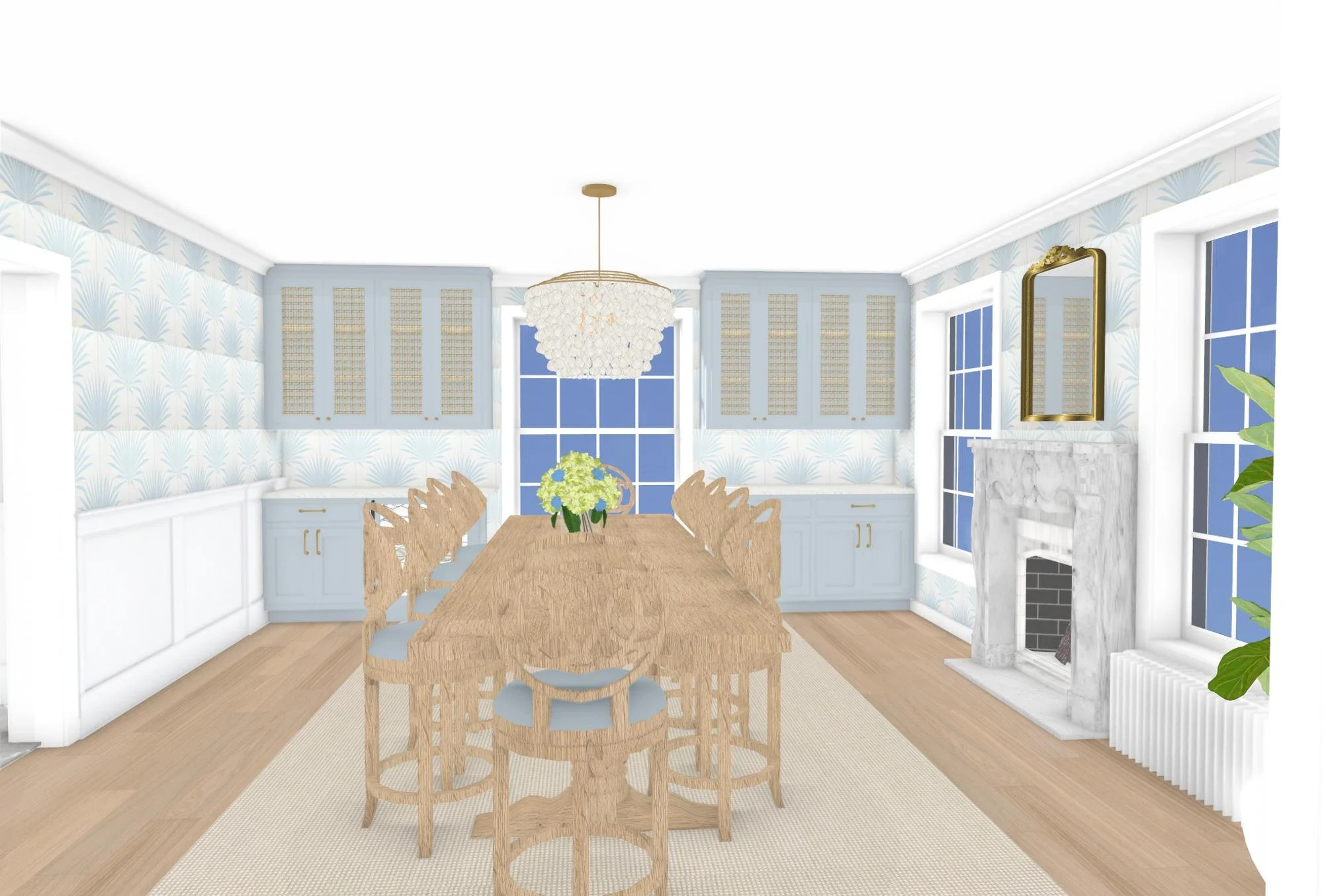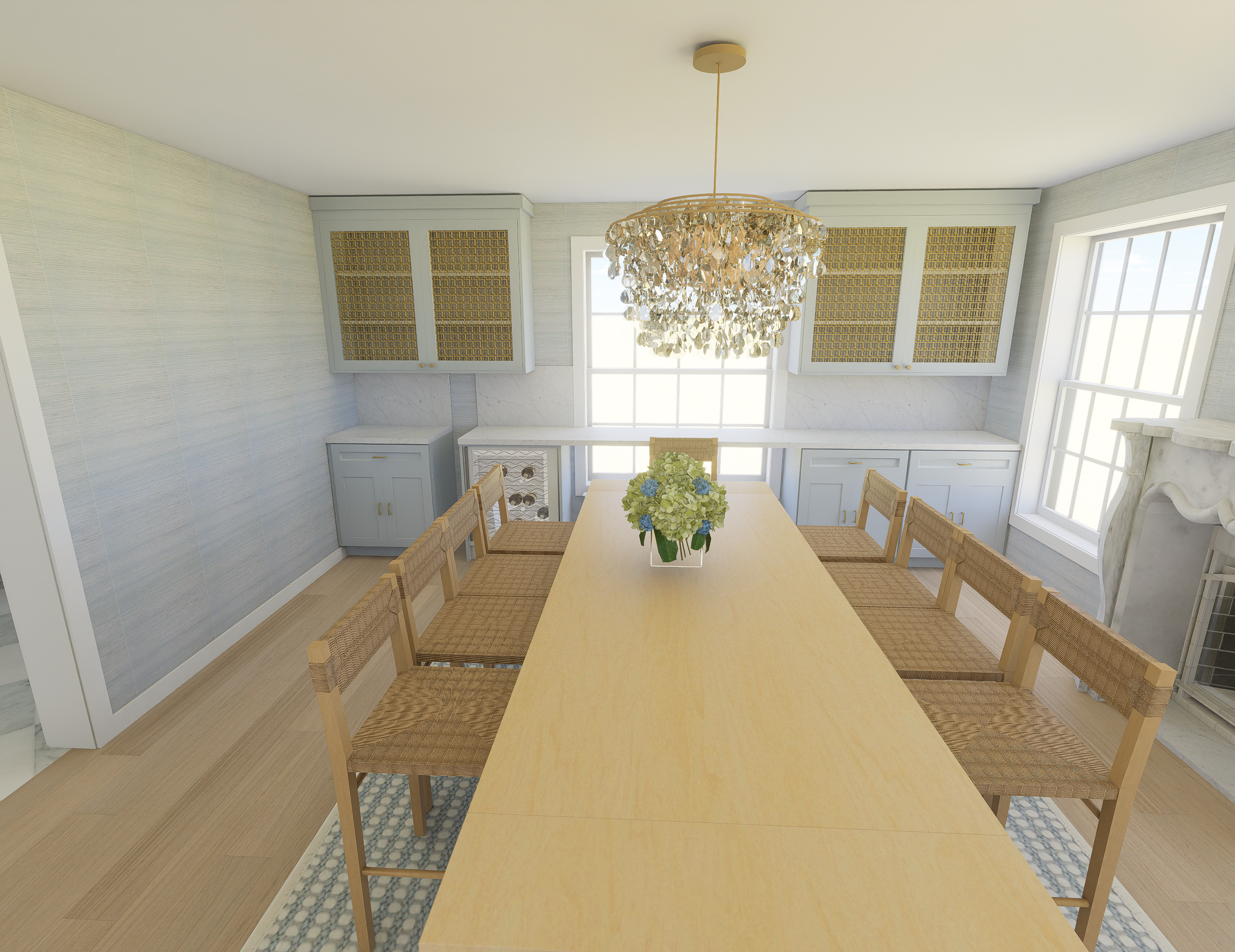 Rendering2- Dining Room. Pottery Barn table, Ernesto rug, Fireplace and Mirror from previous, West Elm chandelier, wainscoting in Super White, Schumacher wallpaper. Built-in serving and bar in Upward with brass insert, beverage center, and counter in Bianco laguna.