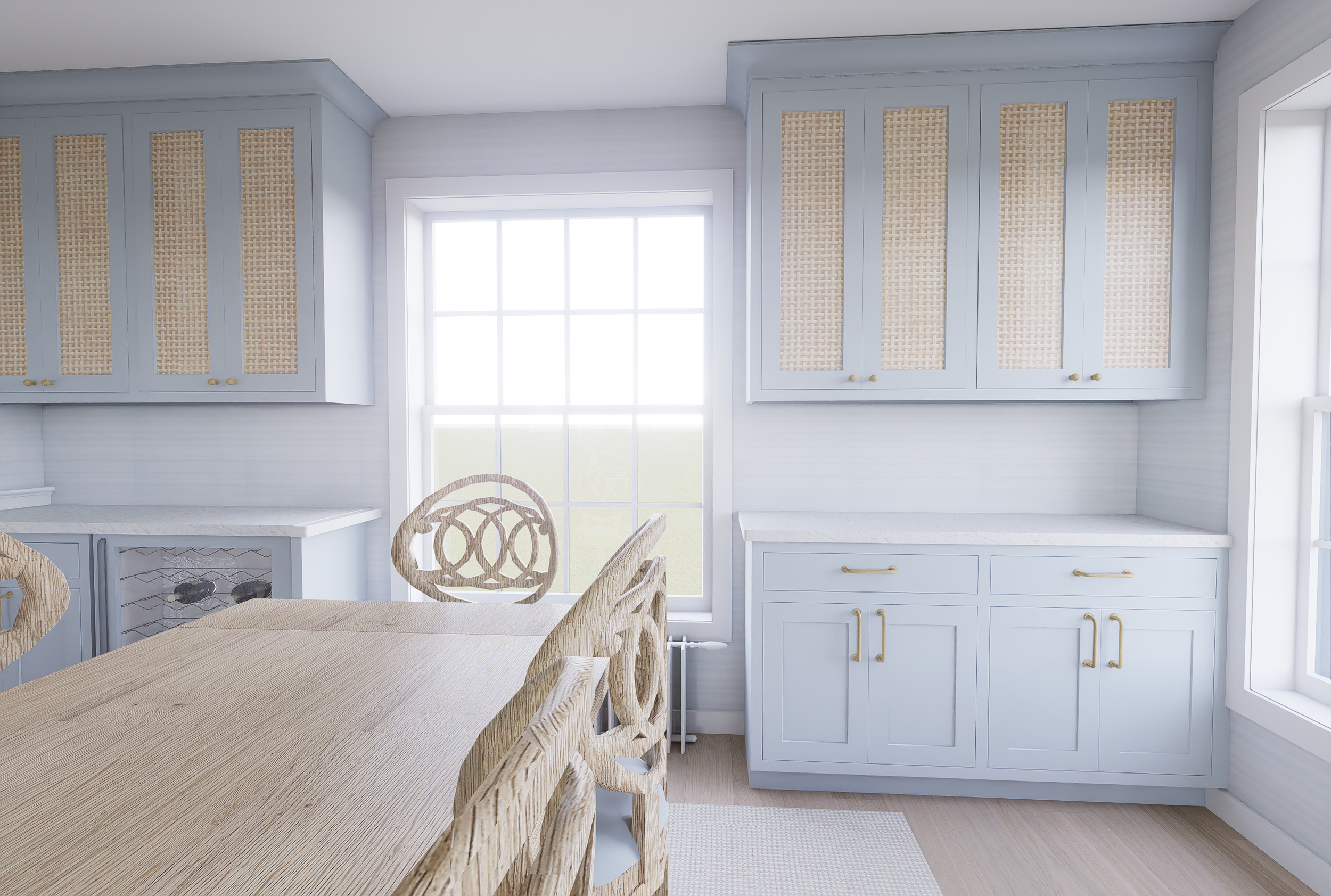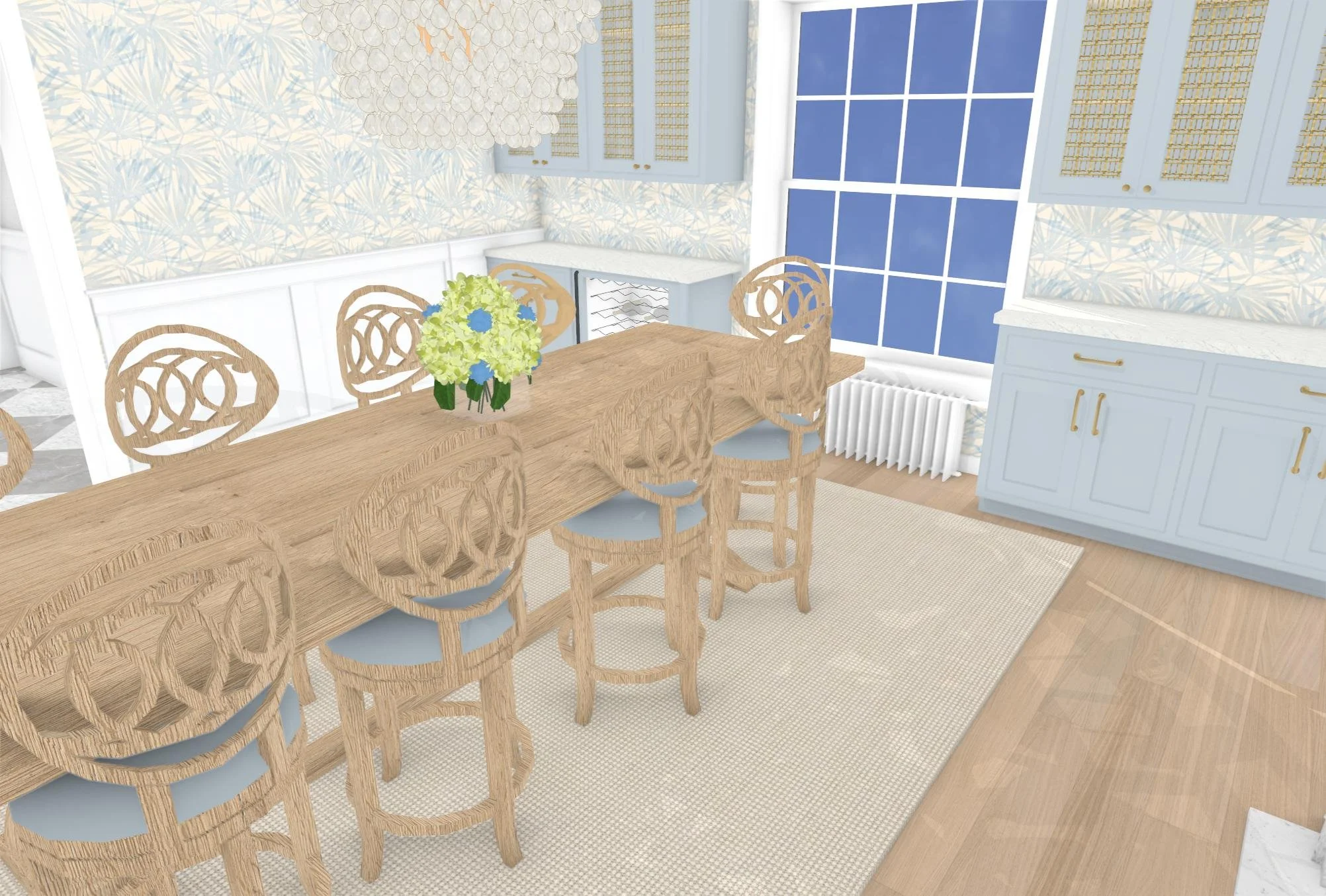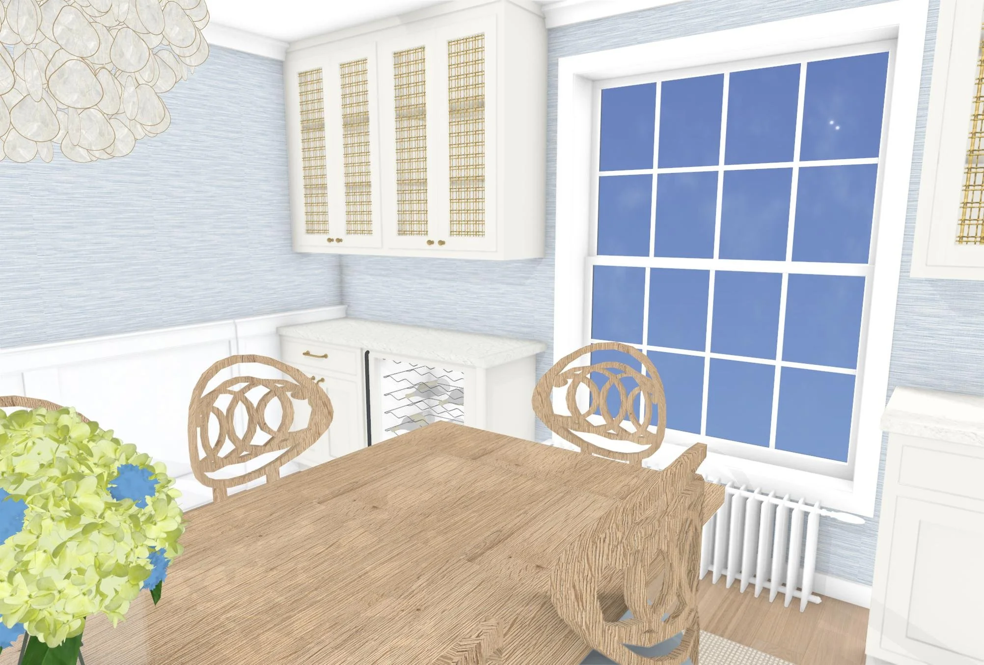 Rendering2- Dining Room. Pottery Barn table, Ernesto rug, Fireplace and Mirror from previous, West Elm chandelier, wainscoting in Super White, Schumacher wallpaper. Built-in serving and bar in Upward with brass insert, beverage center, and counter in Bianco laguna.