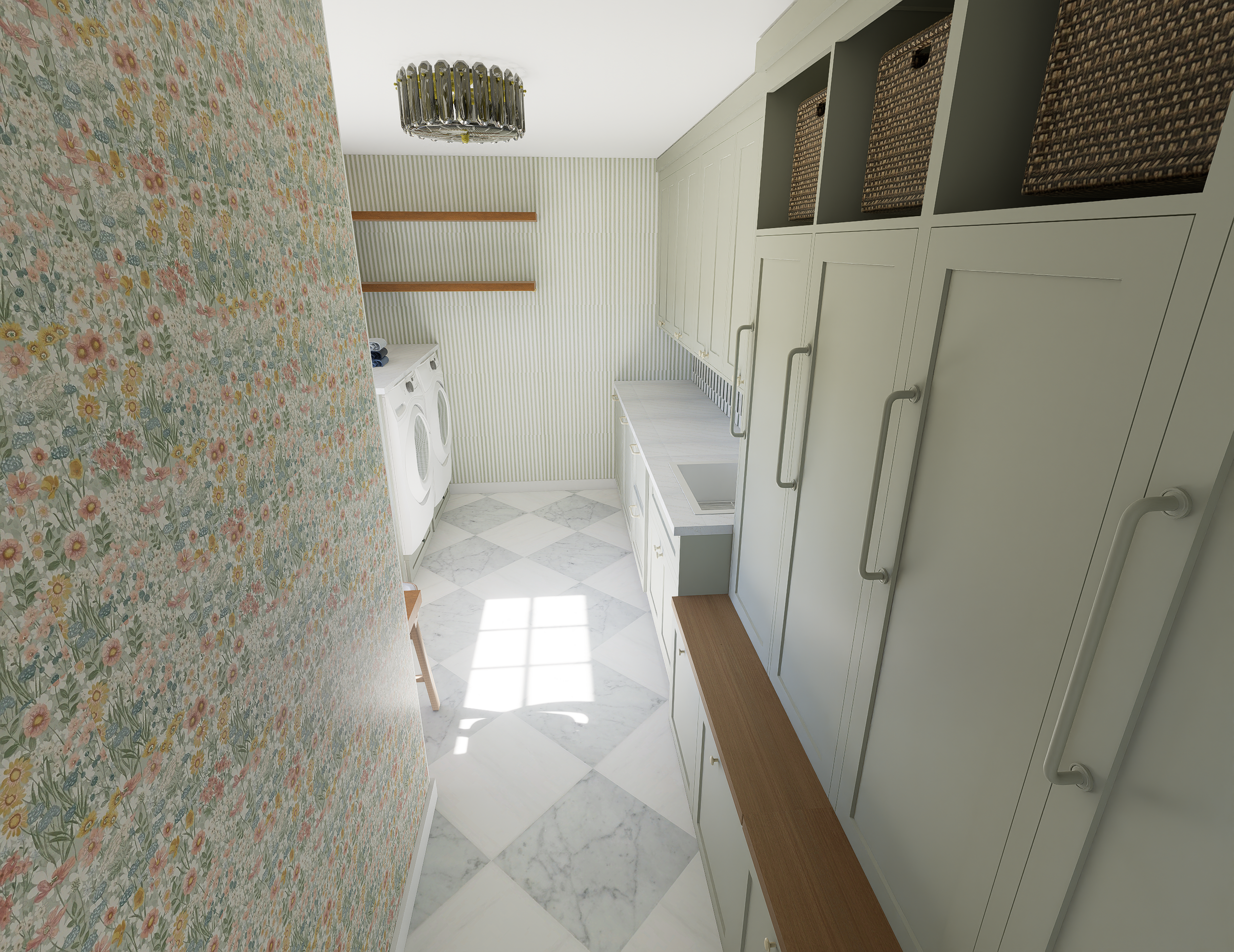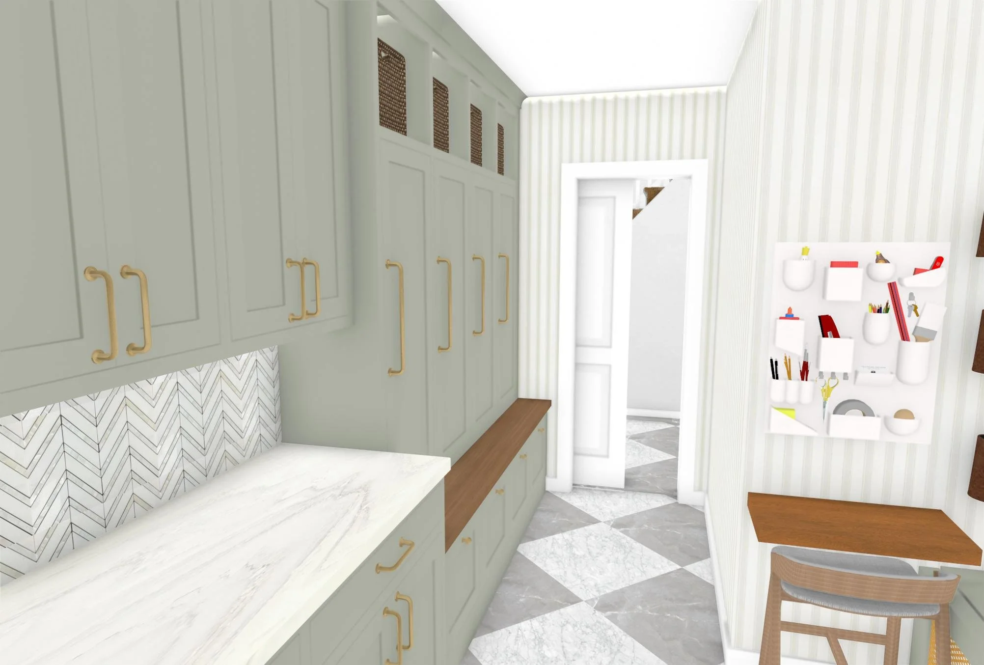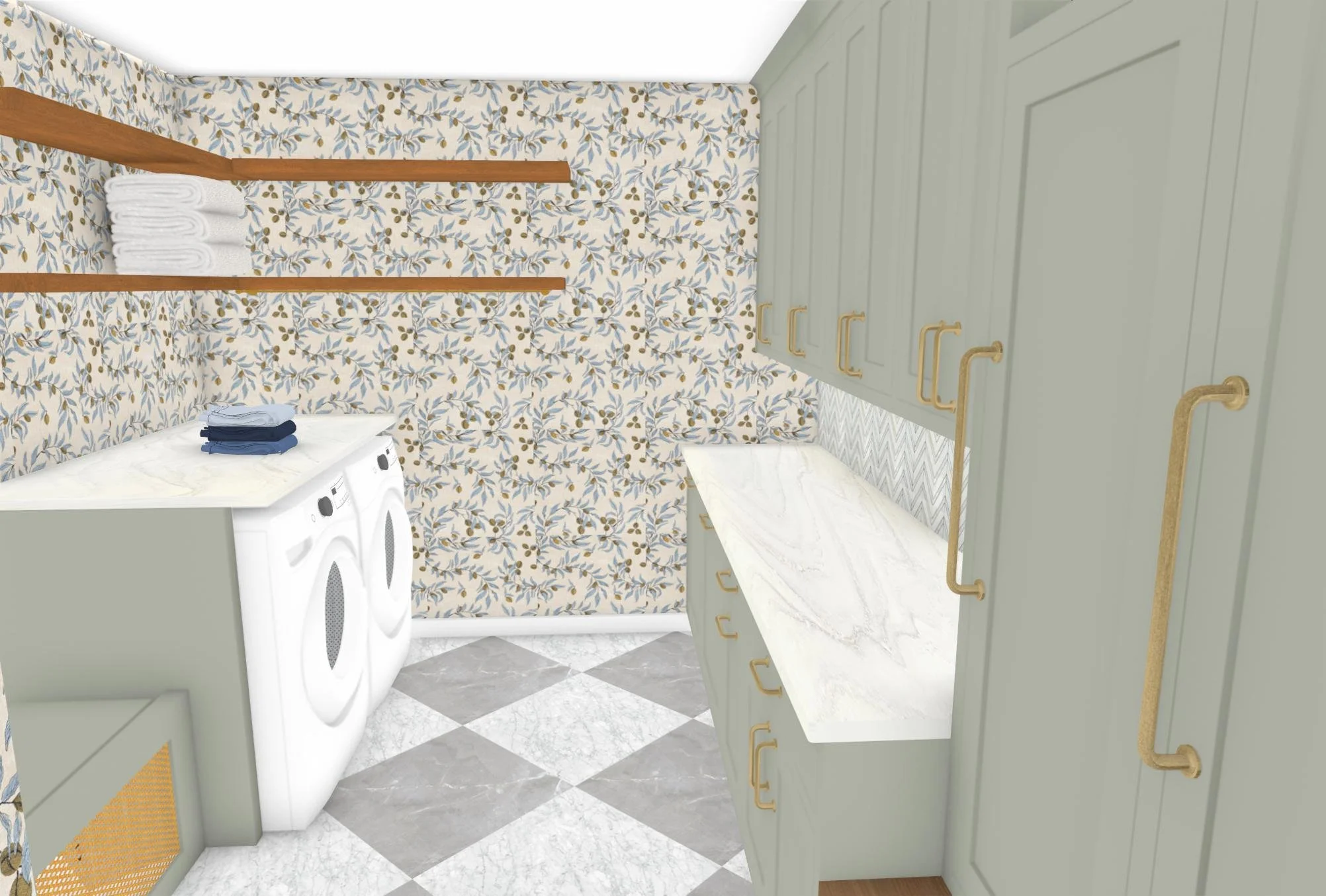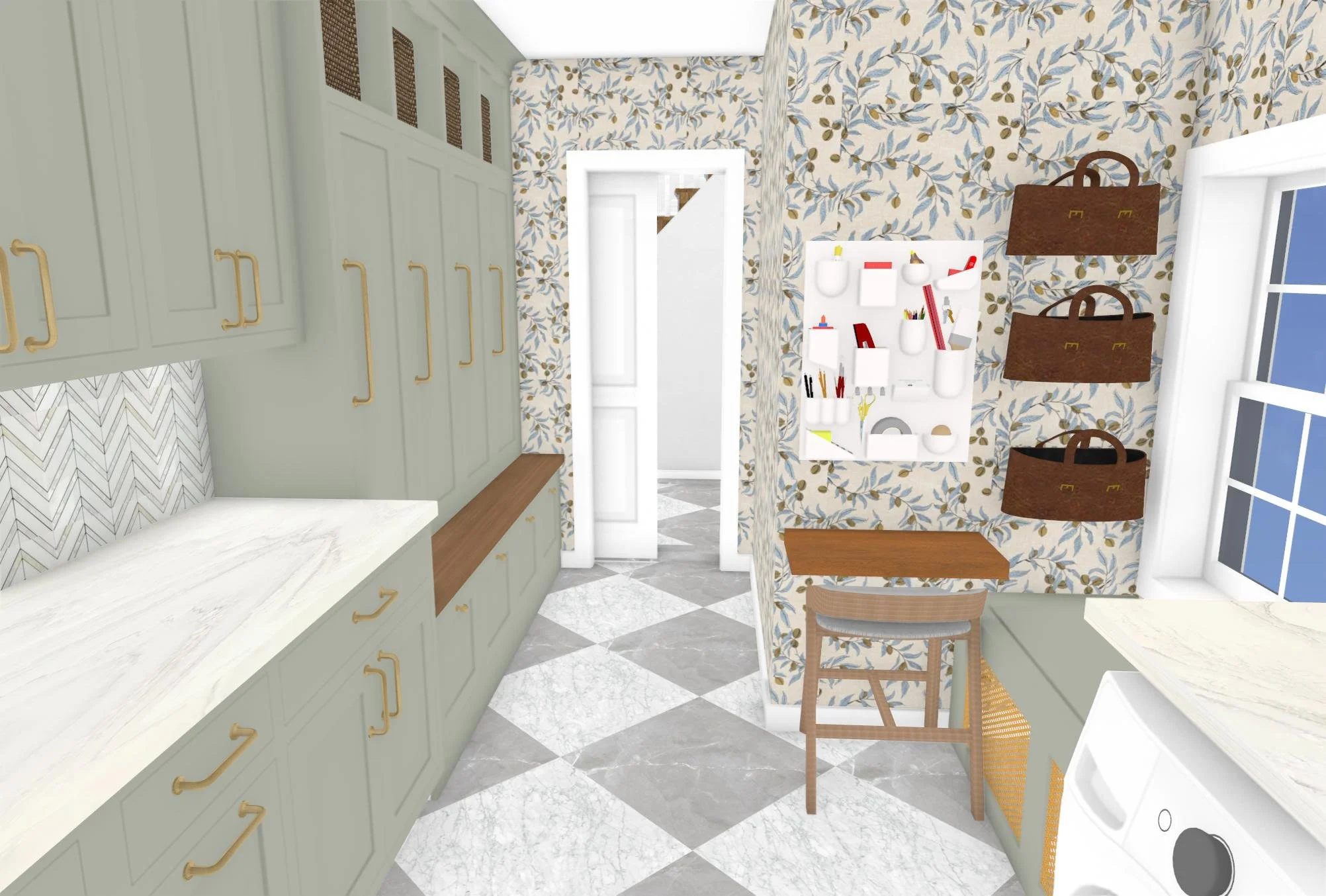 Rendering2- Mud. Cabinets in Blue Gray, Counter in Everleigh, Backsplash in herringbone, Pecan Wallpaper, Floating shelving, drop zone for paperwork, and checkered floor.