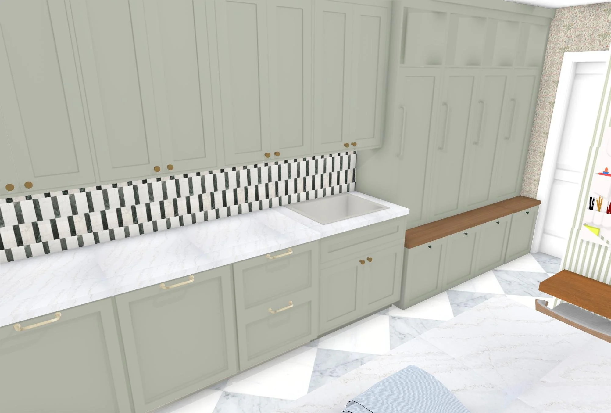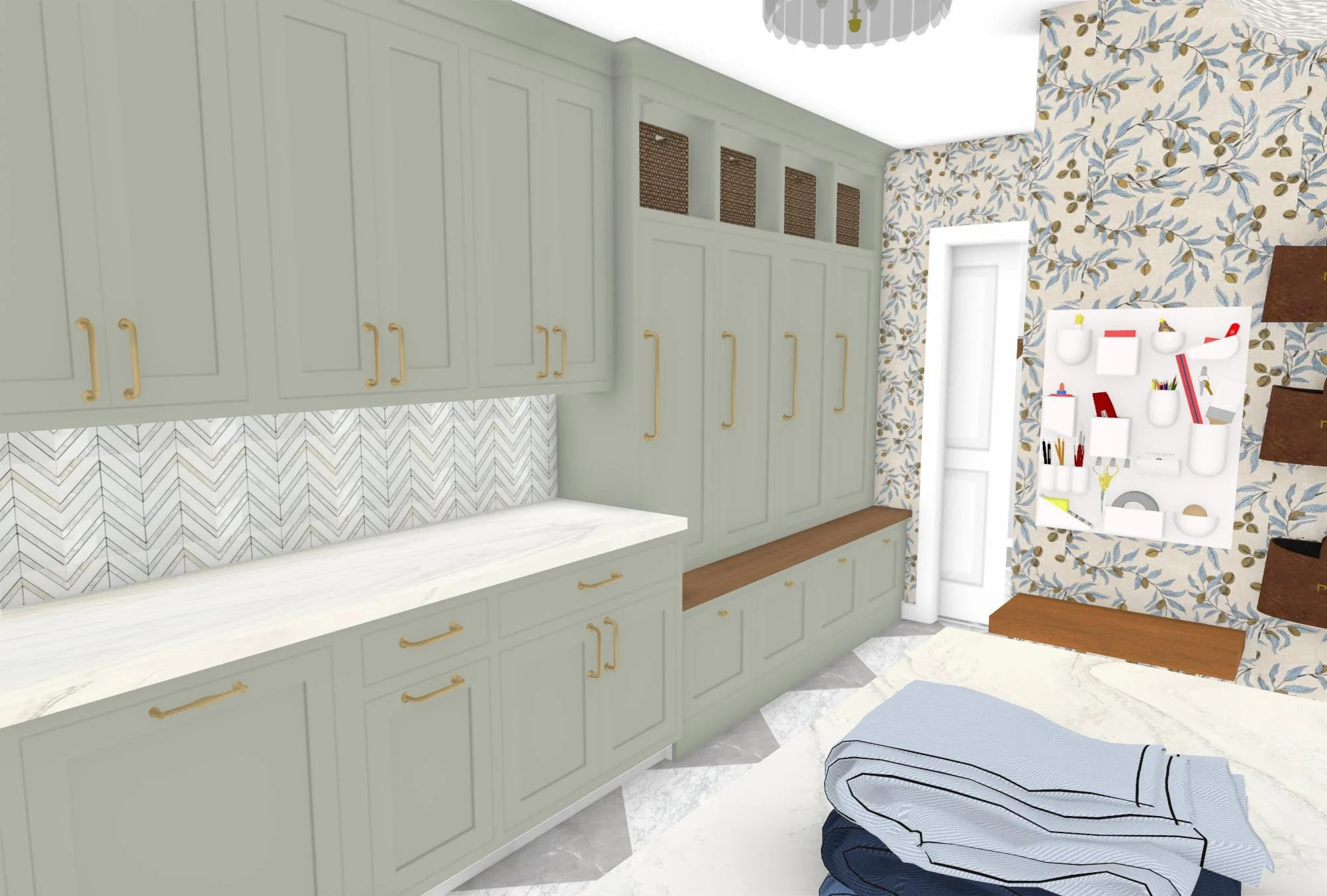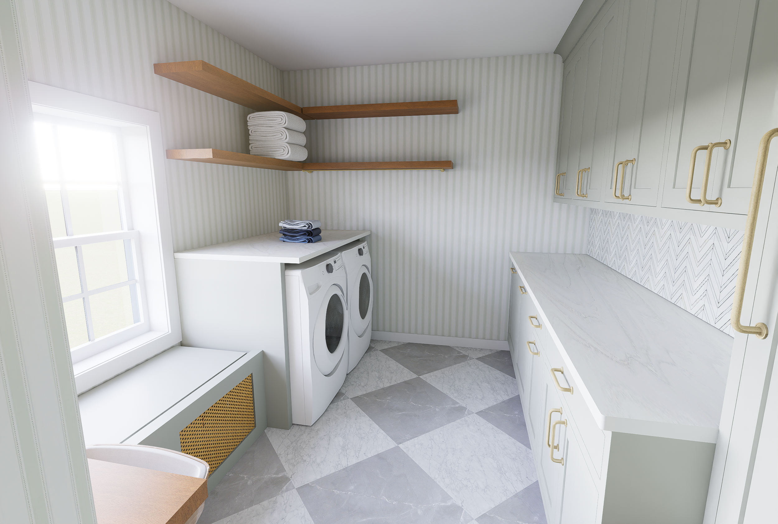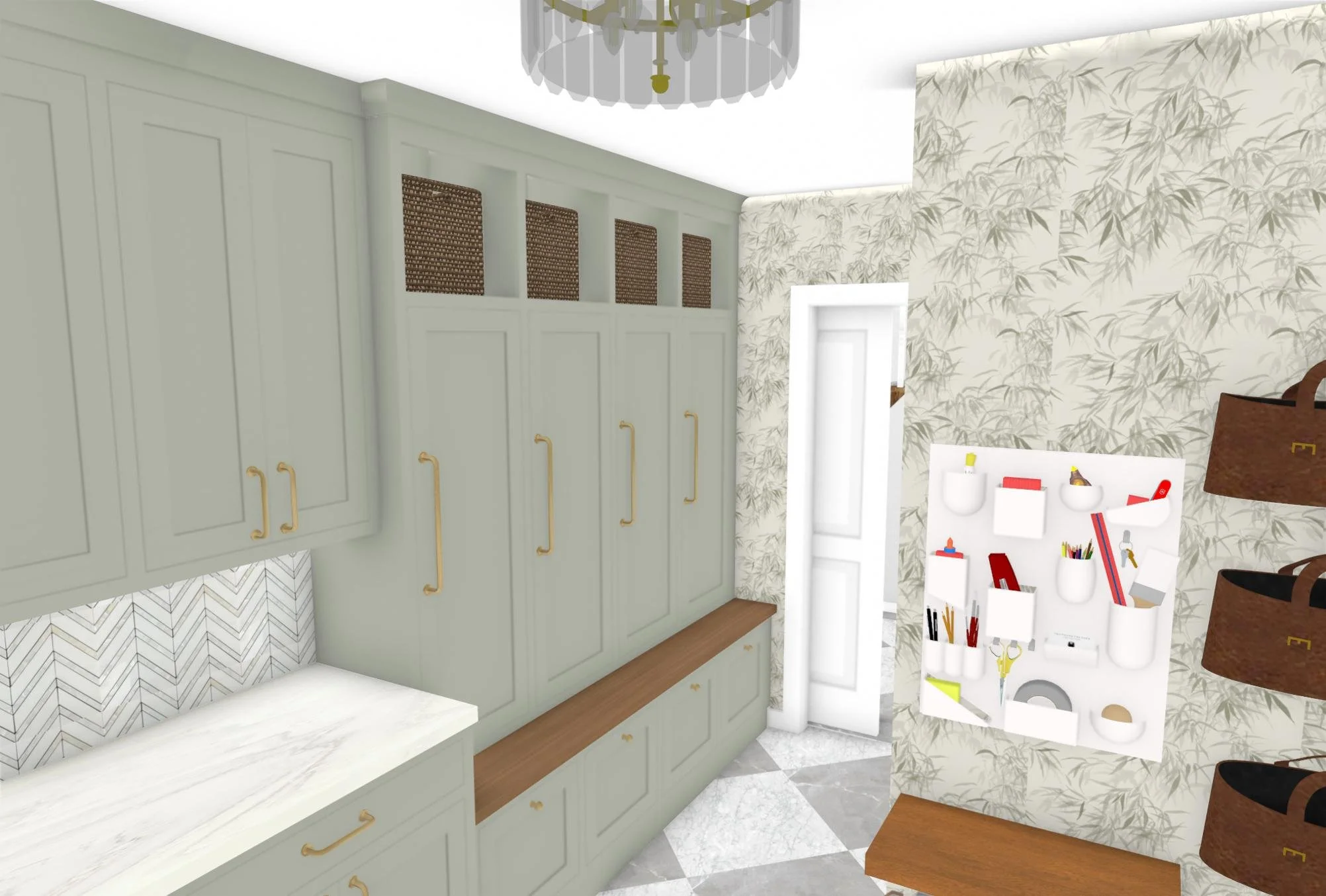 Rendering2- Mud. Cabinets in Blue Gray, Counter in Everleigh, Backsplash in herringbone, Pecan Wallpaper, Floating shelving, drop zone for paperwork, and checkered floor.