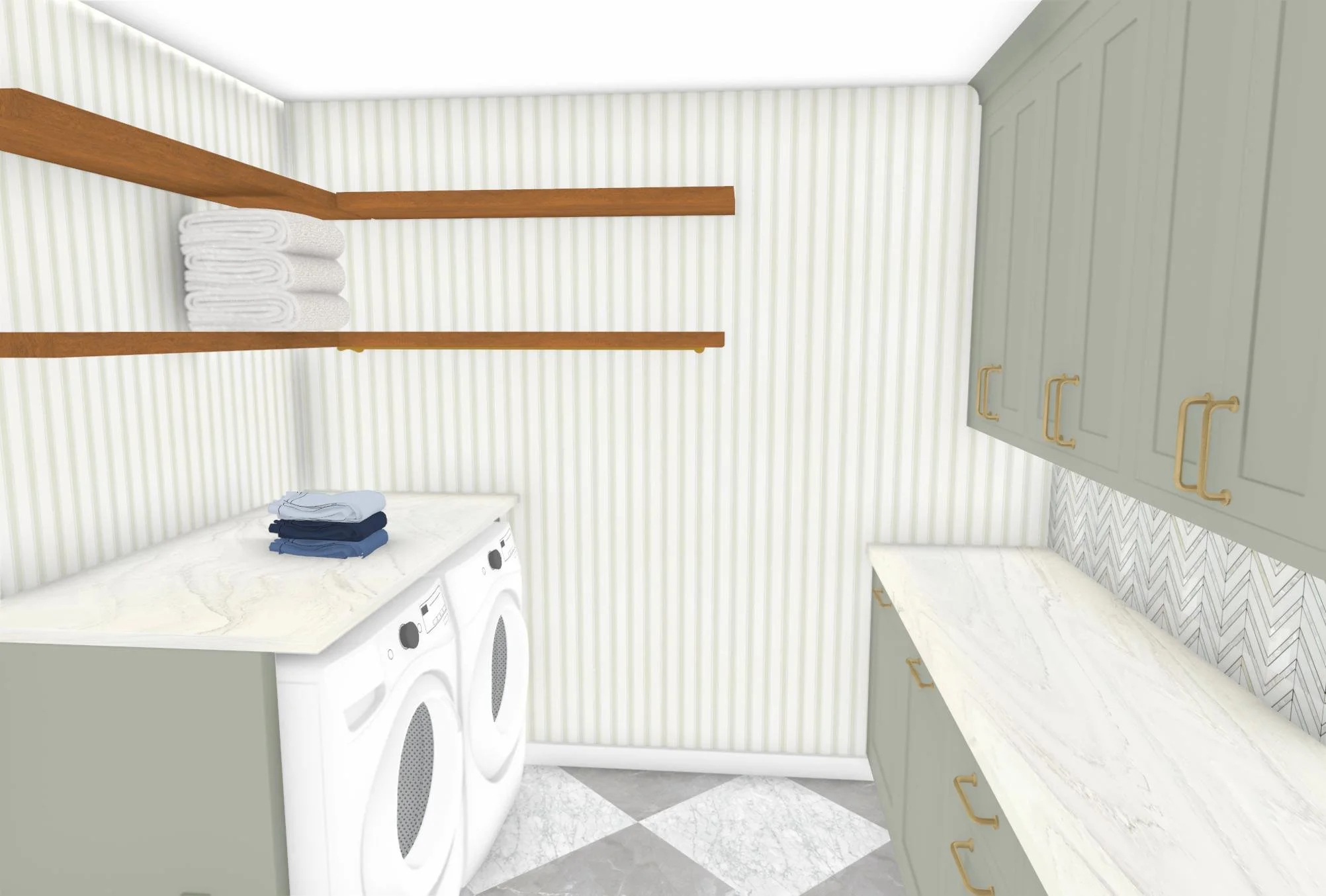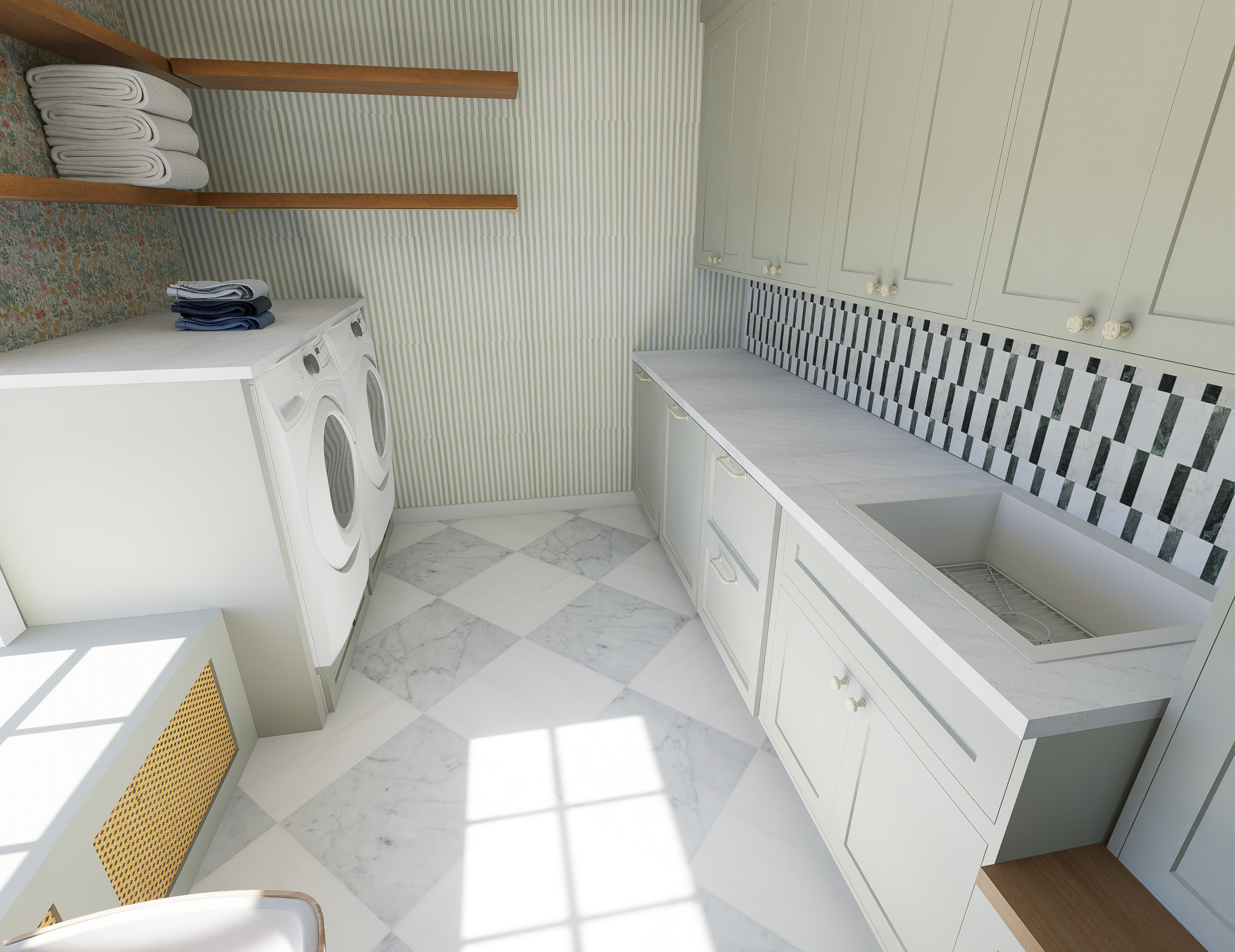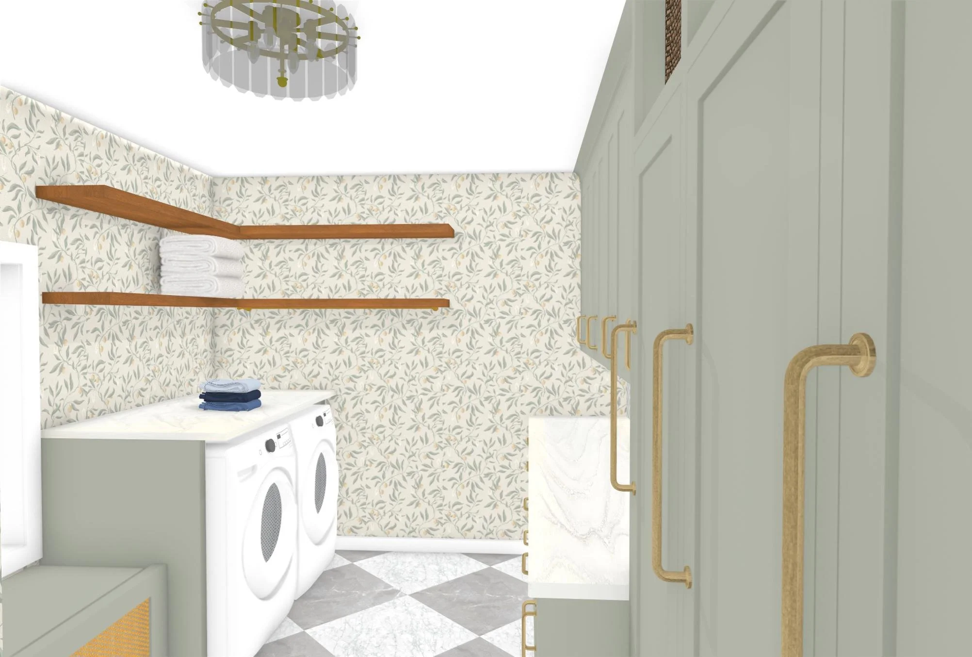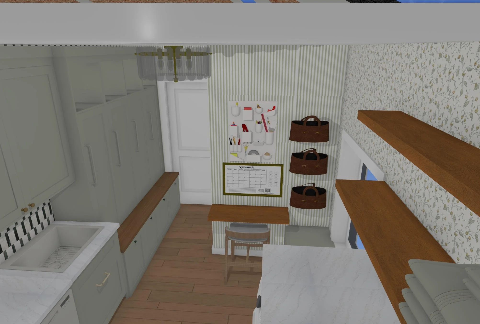 Rendering2- Mud. Cabinets in Blue Gray, Counter in Everleigh, Backsplash in herringbone, Pecan Wallpaper, Floating shelving, drop zone for paperwork, and checkered floor.