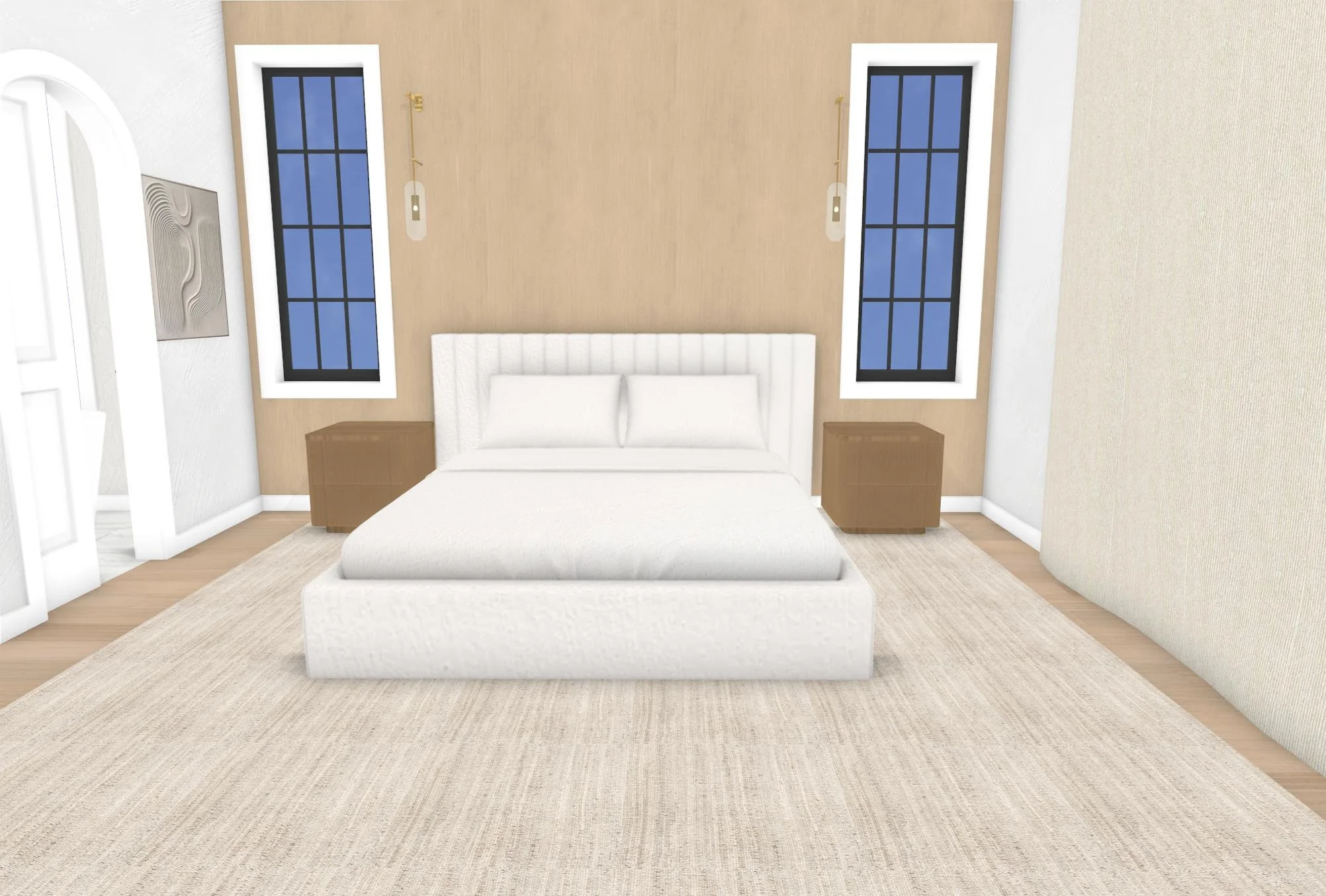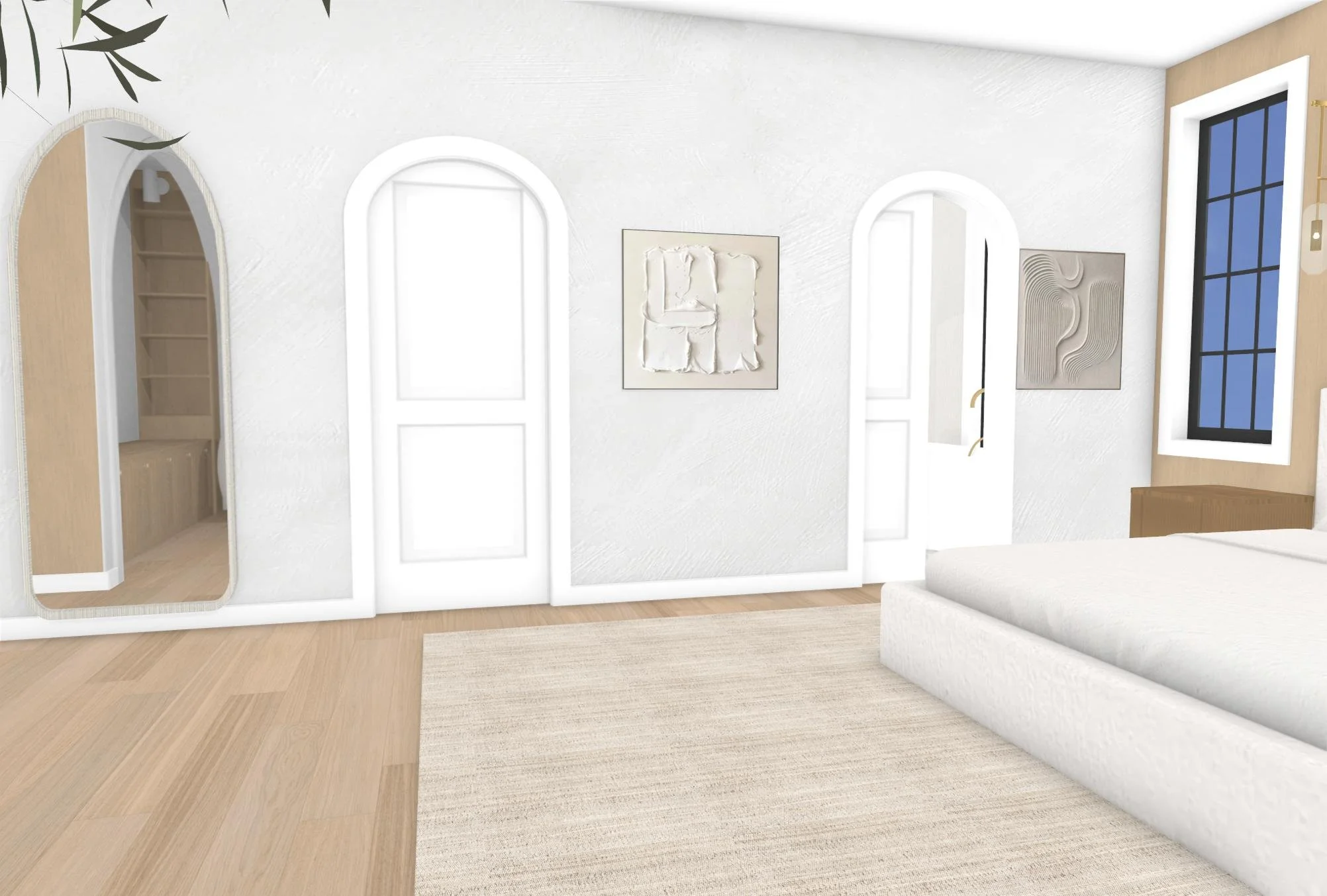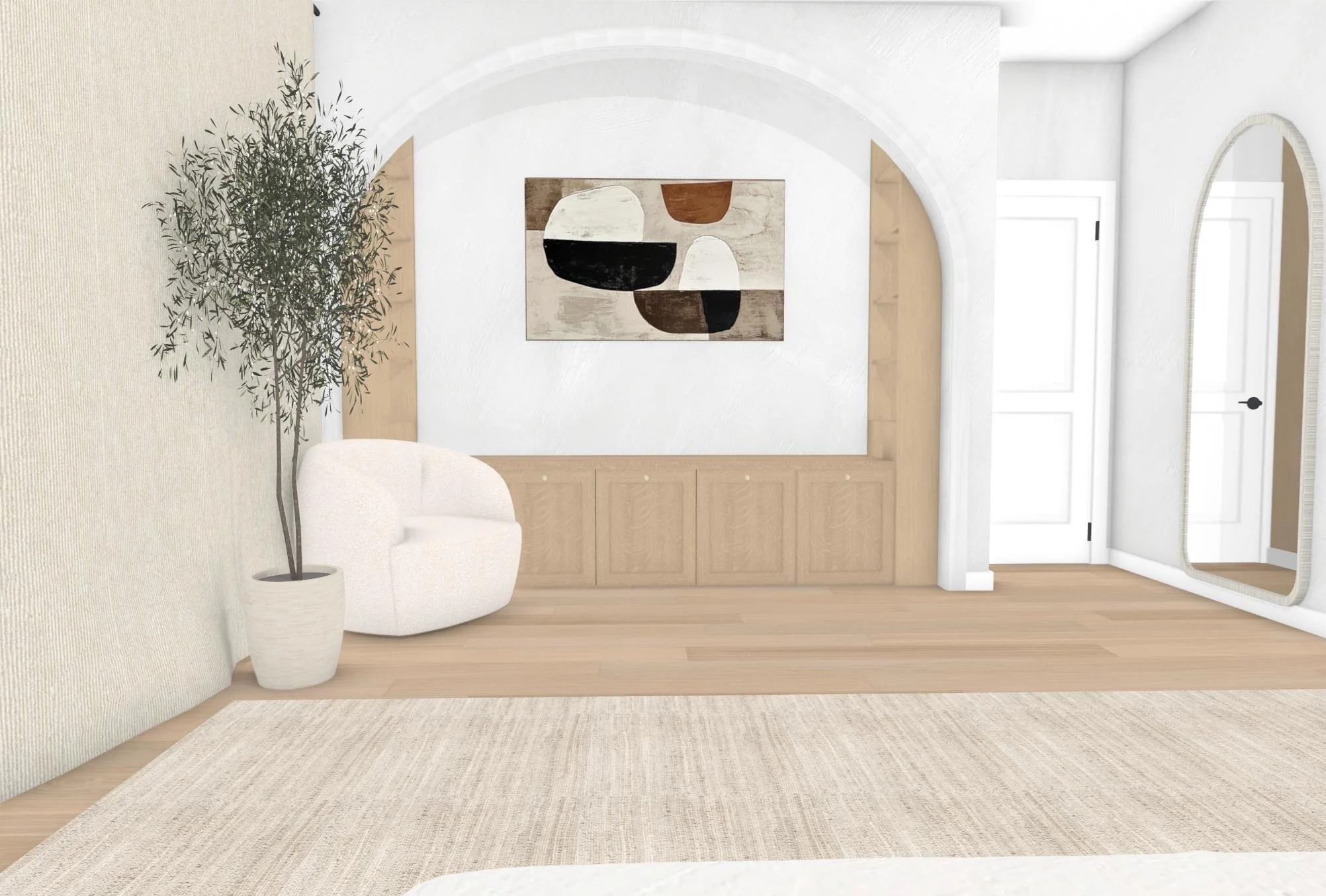 4D- Primary Bedroom with moved windows to allow for sconce lighting and built-in drawers under Frame TV.