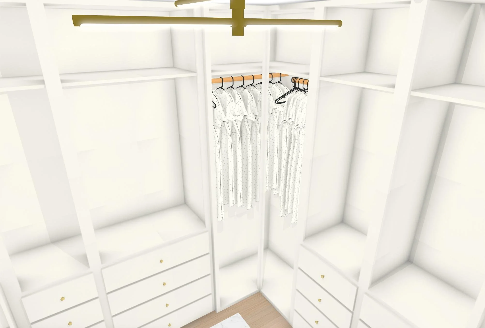 Primary Closet- with extra shoe storage, small island, electric washer dryer and steam closet, and upper storage for linens.